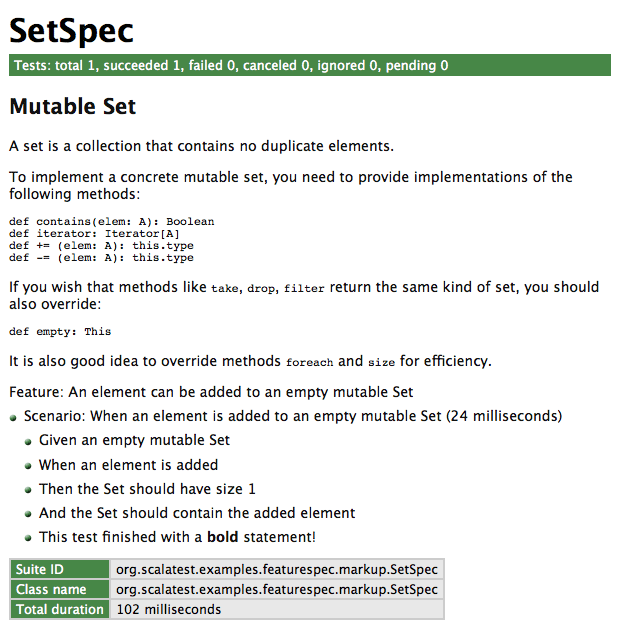 Each scenario represents one test. The name of the test is the spec text passed to the scenario method.