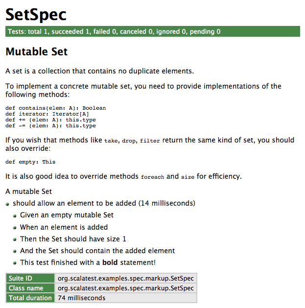 markup("This test finished with a **bold** statement!") } } }Although all of ScalaTest's built-in reporters will display the markup text in some form, the HTML reporter will format the markup information into HTML. Thus, the main purpose of